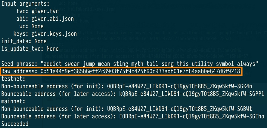 Save Raw address value - you will need it to deploy your contract and to work with it.