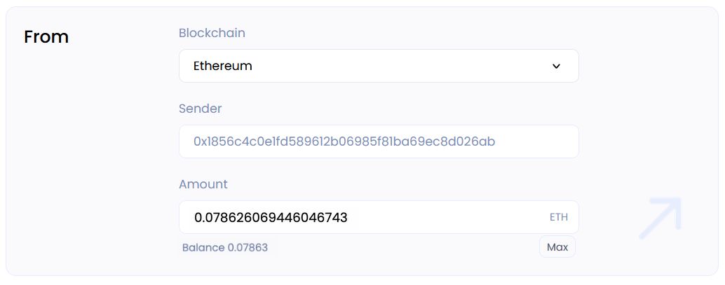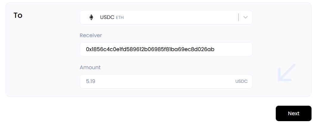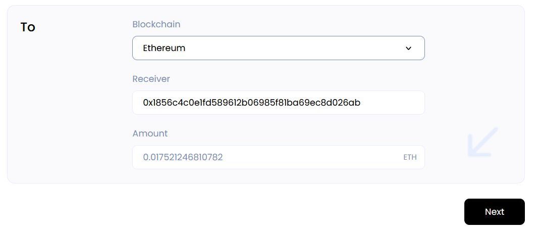 In the To section, make sure to choose the Ethereum blockchain network and verify the Receiver's wallet address for accuracy before proceeding. The ETH amount will be automatically calculated.