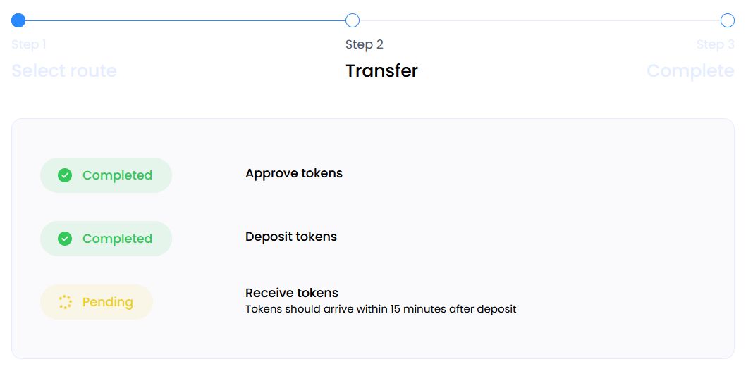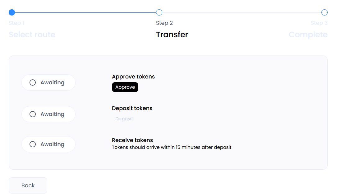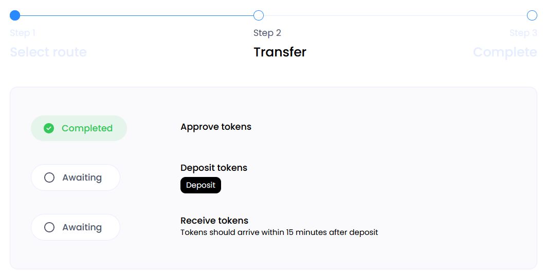 The first one is to approve tokens, followed by deposit tokens, and finally, waiting for the transfer to be completed.