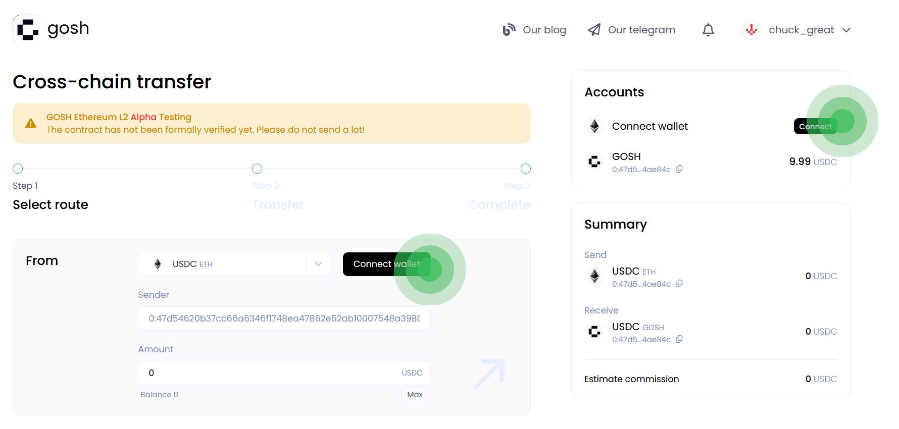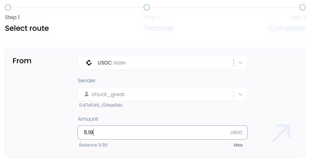 Enter the wallet address or GOSH username of the recipient for the transfer. The Amount field will indicate the transferred amount (minus the commission) that will be credited to the recipient's wallet in GOSH.