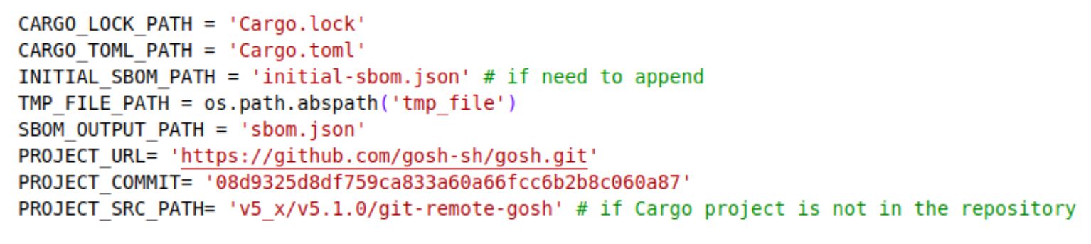 usage: generate-sbom.py [-h] [--cargo-lock CARGO_LOCK_PATH] [--cargo-toml CARGO_TOML_PATH] [--initial-sbom INITIAL_SBOM_PATH] [--sbom-output SBOM_OUTPUT_PATH] [--project-src PROJECT_SRC_PATH] [--project-commit PROJECT_COMMIT] [--project-url PROJECT_URL] Generate software bill of materials (SBOM) for Rust project options: -h, --help show this help message and exit --cargo-lock CARGO_LOCK_PATH Path to Cargo.lock file. Default - ./Cargo.lock --cargo-toml CARGO_TOML_PATH Path to Cargo.toml file. Default - ./Cargo.toml --initial-sbom INITIAL_SBOM_PATH Optional. Path to initial SBOM JSON file if need to append existing SBOM. Default - initial-sbom.json. Will ignore if file doesn't exist. --sbom-output SBOM_OUTPUT_PATH Path to output SBOM JSON file. Default - sbom.json --project-src PROJECT_SRC_PATH Path to the Rust project source if not in root git directory. Not relates to local file system path. Relates to path inside repo structure. For example we can use v5_x/v5.1.0/git-remote-gosh which means s://github.com/gosh- sh/gosh/v5_x/v5.1.0/git-remote-gosh --project-commit PROJECT_COMMIT Commit of the project. Default - commit parsed with 'git rev-parse HEAD' command in dir where Cargo.lock is located. --project-url PROJECT_URL URL of the project's repository. Default - project URL parsed with 'git config --get remote.origin.url' command in dir where Cargo.lock is located.For_example