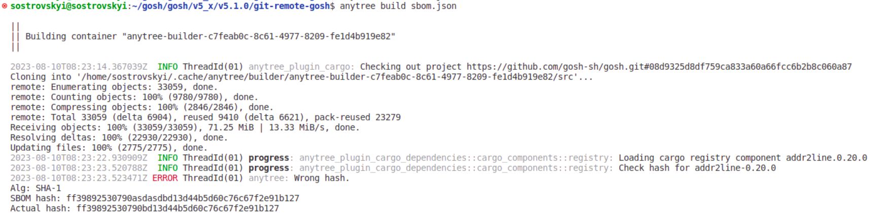 Deep SBOM extends the SBOM surface to include all build environments. It is impossible to inject malicious commits backwards on GOSH and miss dependency tampering during the CI/CD process when using Deep SBOM. Integrating GOSH Builder with AnyTree proves builds on a developer machine and a server (or a cloud) are identical.