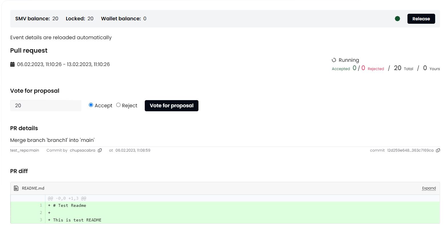 When merging into the main branch, and in some other cases (depending on DAO setup), a DAO proposal will be initiated by trying to commit.