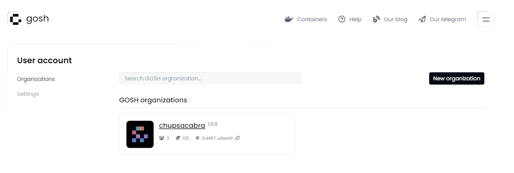 Once created, your organization will appear in the organization list. Click on it to continue.