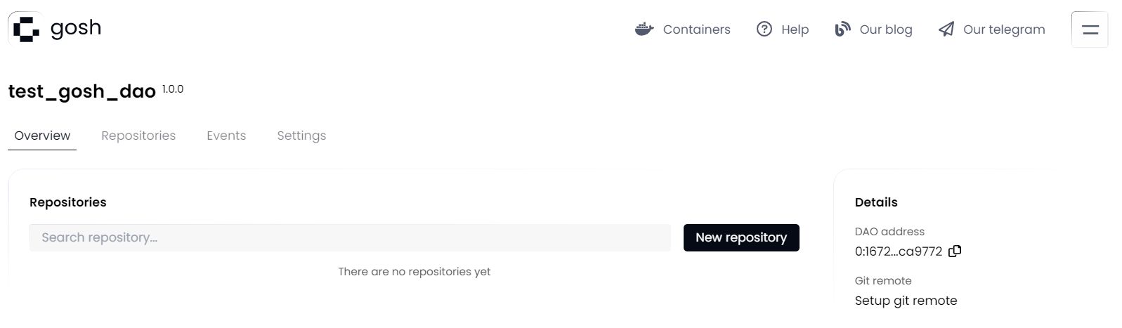 You will be able to create your GOSH account and Decentralized Autonomous Organization (DAO), set up and manage repositories through a graphical interface directly in Docker Desktop. Repositories stored in GOSH can then be interacted with like any regular remote repository, with a few small configurations to git, making decentralized code management easily available to anyone.