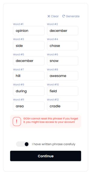 Your seed phrase will be used to log into GOSH.