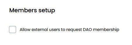 In the Members setup section, you can grant or deny external users the ability to request membership in this DAO.