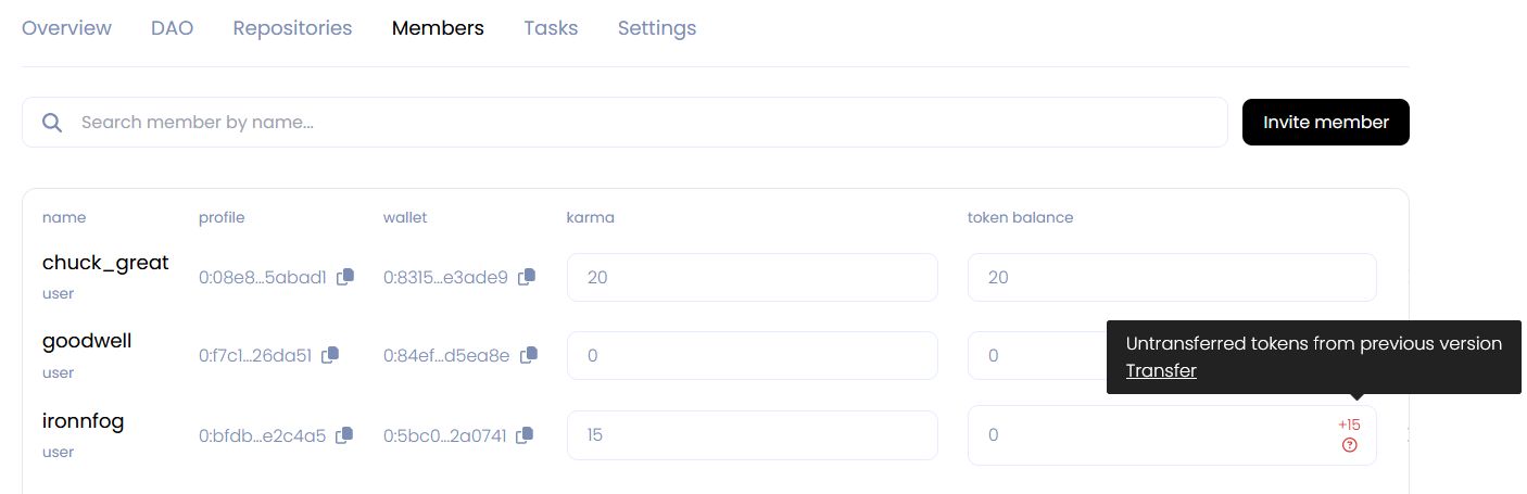 If you have a DAO version lower than the 4th inclusive, then to transfer tokens, go to the Overview tab in the Your wallet balance section and click Transfer from previous version.