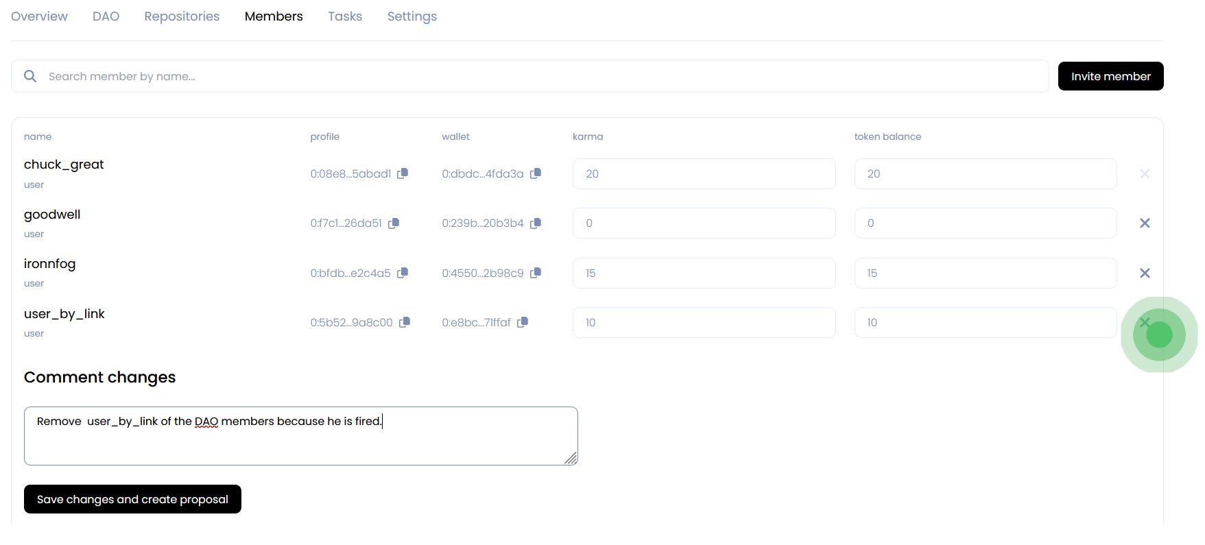 To delete a member from the DAO, go to the Members tab and click on the cross to the desired member.